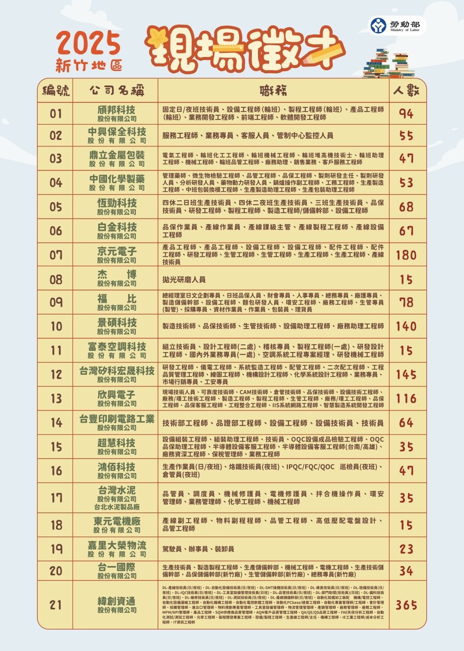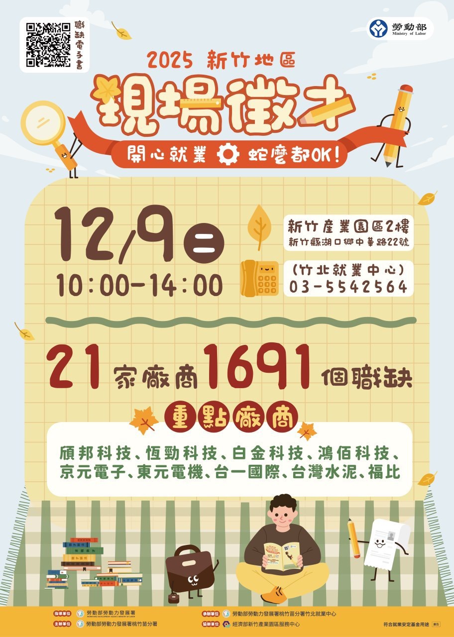 勞動部勞動力發展署桃竹苗分署將於12月9日(星期二)上午10點至下午2點,於新竹產業園區服務中心2樓(新竹縣湖口鄉中華路22號)舉辦「2025年新竹地區現場徵才活動」。這場活動集結科技、製造、運輸、電子與網路服務等多元產業,共21家優質企業、提供多達1,691個職缺,為年底求職市場掀起一波轉職熱潮,歡迎正在求職、尋求轉換跑道,或希望再次投入職場的民眾踴躍參加。
