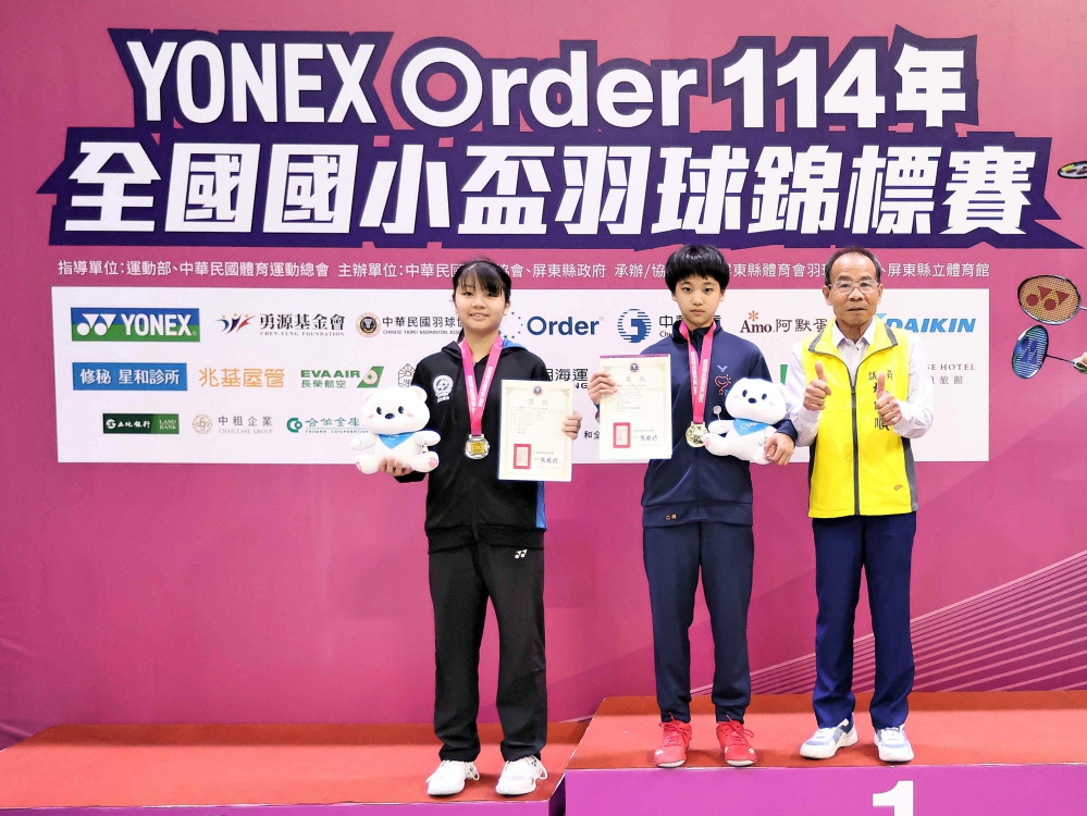 YONEX Order 114年全國國小盃羽球錦標賽12/13日在屏東縣立體育館展開各項單雙打會內賽,六年級女單決賽與女雙決賽是最受矚目的賽事,因女單第一種子的亞柏高雄市前鎮區民權國小劉芯羽,頗有戴資穎的球風,實力明顯高於所有對手,果然在決賽輕鬆直落兩局拿下冠軍。女雙則是由台南市佳里區仁愛國小江品妍/王宥靚以二比一戰勝對手,奪下女雙冠軍。