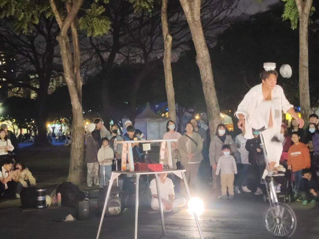 表演開始進入尾聲,氣氛迅速被拉到最高。騎著獨輪車前進已非易事,而他卻在移動中挑戰單腳平衡,另一隻腳上還放著一只碗,接著將腳上的碗踢起,準確地與頭上的碗重疊。這樣的動作,光是想像就讓人捏一把冷汗,而他卻一次次穩穩完成,現場不時傳來驚呼聲。真正的高潮,出現在壓軸橋段——他站上如同磚塊般一層層堆疊的道具,每增加一塊高度,觀眾的心就跟著被提得更高。現場安靜得只剩下呼吸聲,直到最後,在眾人此起彼落的加油聲中,他成功完成高難度動作,全場瞬間爆出掌聲、尖叫與歡呼,那一刻,努力被完整地看見了。