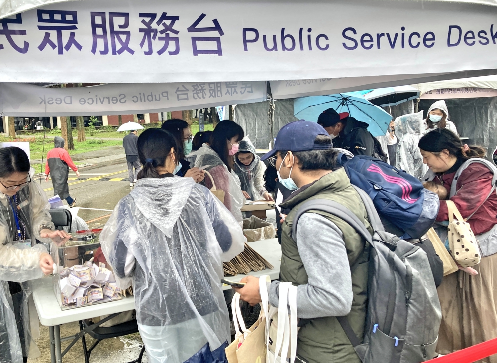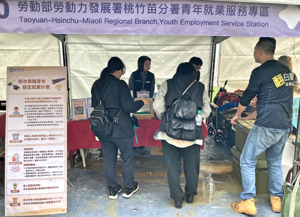 ▲勞動部2025首場大型就業博覽會今(3/15)日在陽明交大重磅登場,盡管在大雨滂沱的天侯下,桃竹苗分署新竹就業服務中心設置的服務台,仍舊有源源不斷前來求職人潮排隊報名。
