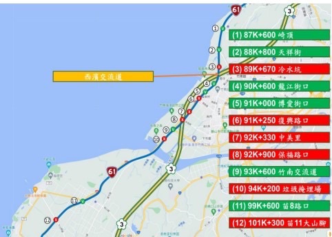 根據交通部公路局中區養護工程分局分析去(113)年所有連續假期交通流量,預估本次連假第1天(10月4日)10至15時,台61線香山至竹南南向路段將出現大量返鄉及旅遊車潮,尖峰每小時交通量達1萬6,000車次,10月6日北返車流後龍至香山全日交通量更可能高達9,000車次;據此,中區養護工程分局特別規劃台61線竹南至後龍段12處平面交岔路口號誌實施遞亮式優化時制,同樣於管制時段調整行車管制號誌總週期270秒北上續進(其餘時段為總週期190秒北上續進),封閉台61線與冷水坑、復興路、中美里、保福路、竹南垃圾場、苗11線等6處平交路口,減少車流交織情形,確保主線暢通,提高行車速度;又因應台61線竹南玄寶大橋(87至101公里)改建路段,竹南垃圾場平交路口提前於10月4日10至21時封閉,並於台1己線、明勝路交岔路口及苗9線海寶社區活動中心平交道路口處(北向)派遣義交疏導交通,確保行車順暢。