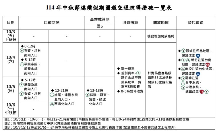114年中秋節為期3天連續假期,交通部高速公路局為分散車流,規劃多項交通管制措施,以期道路交通順暢。