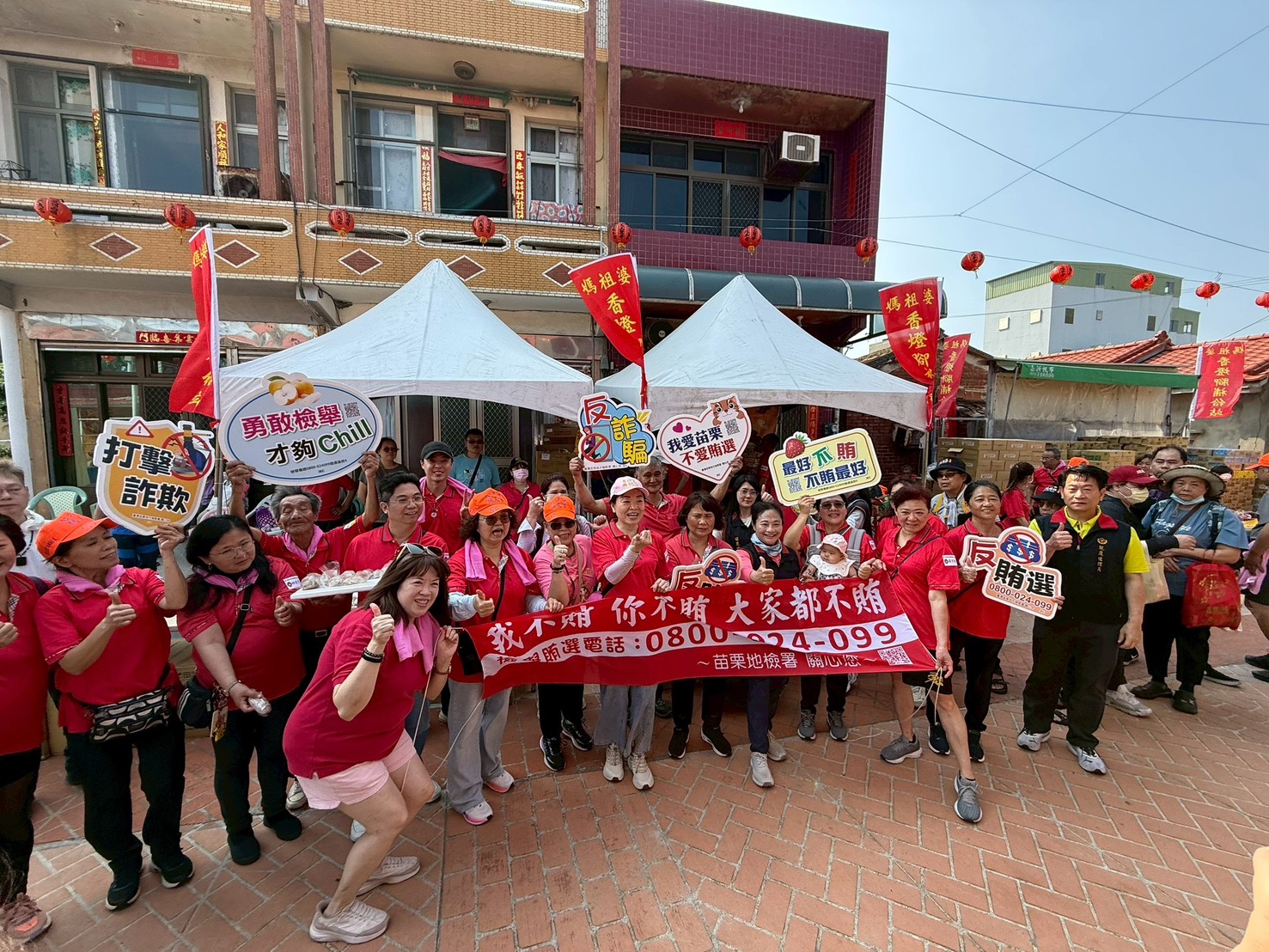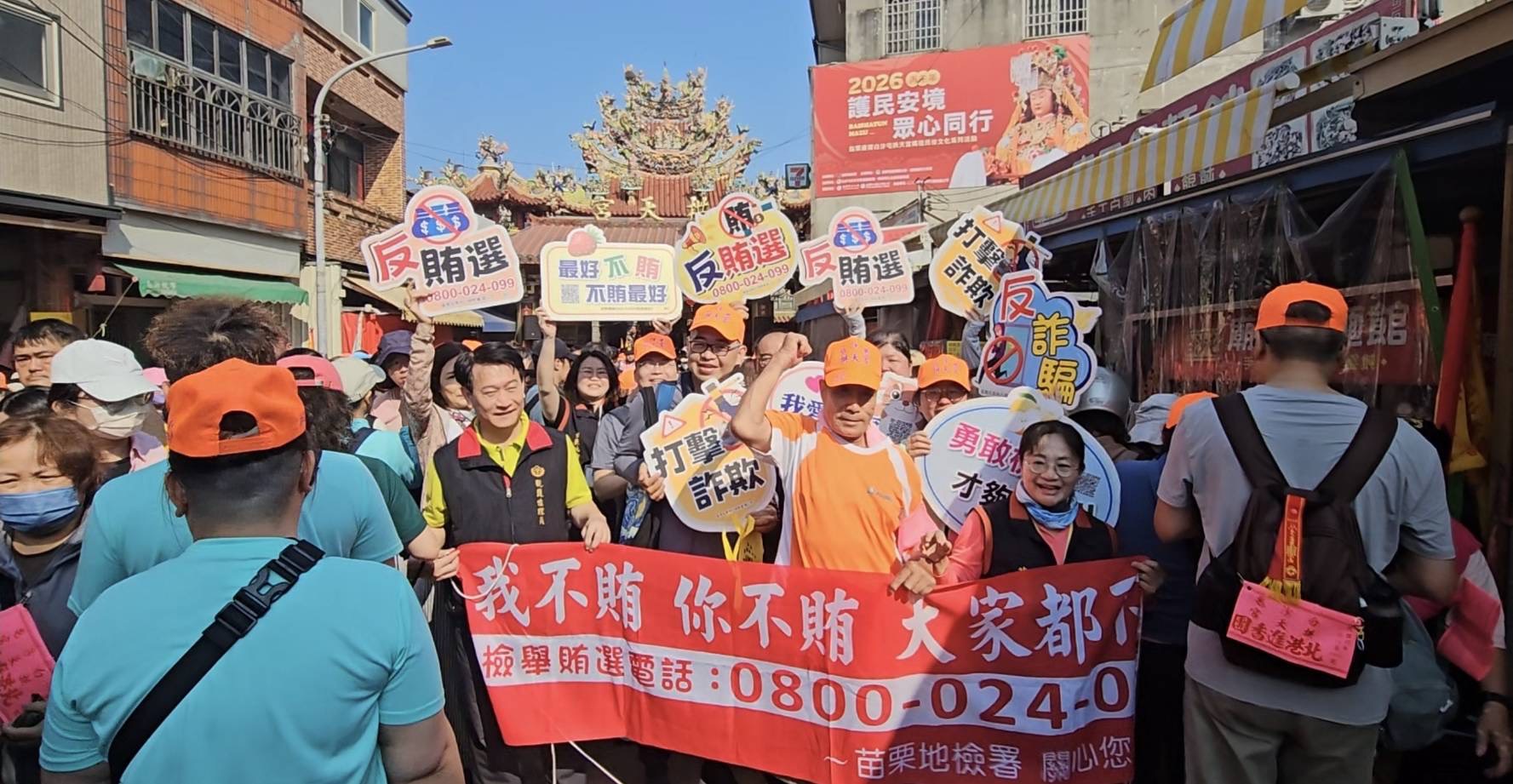 為強化民眾法治觀念,提升反賄選意識,苗栗地檢署於昨(12)日年度宗教盛事「白沙屯拱天宮媽祖進香」起程首日,結合人潮聚集時機辦理法治宣導活動。除設置宣導攤位外,並主動走入進香隊伍,與沿途信眾互動交流,同時於今日發佈反賄選宣導影片,將法治觀念帶入信仰場域,展現檢察機關貼近民眾、與民同行的決心。