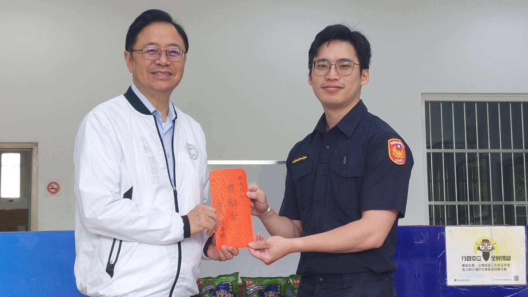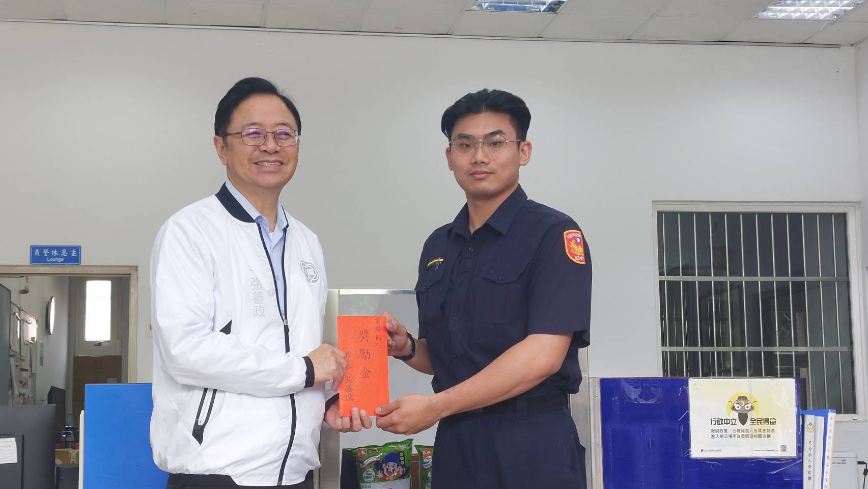 張善政市長對於員警懷抱同理心,以熱忱積極的態度為民眾服務深加讚許,於今(8)日10時許偕同桃園市警局吳坤旭局長、王智民分局長等人親臨龍安派出所,頒贈獎勵金予謝宗燁與徐啟恩員警,表揚兩位同仁積極查緝嫌犯到案及熱忱為民服務的精神,使被害人深刻體驗警察人員保障市民安全、維護治安努力不懈,堪為桃警團隊楷模,期許大家都能學習兩位同仁的執勤態度視民如親,將民眾的事當成自己的事,發揮市民朋友好鄰居的角色,以共同營造安全祥和宜居的社會氛圍。