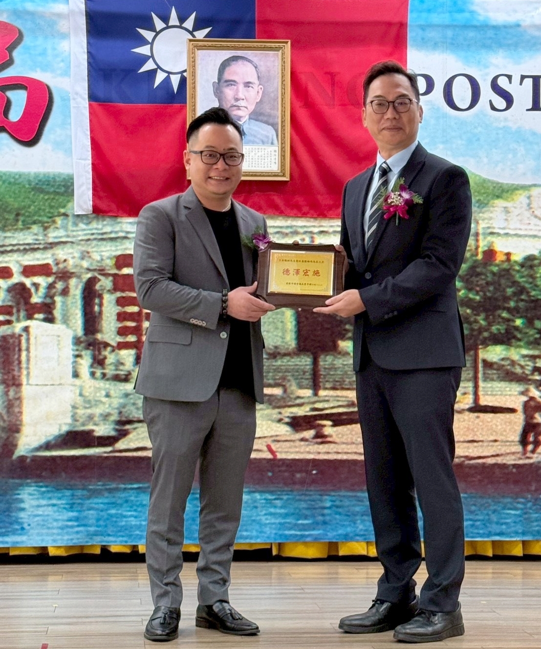 ▲童子瑋議長出席交接典禮贈送獎牌給新任吳聰明局長。圖/翻攝