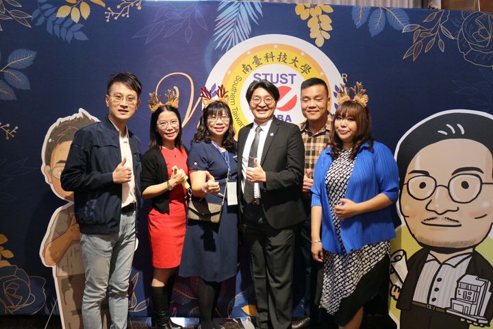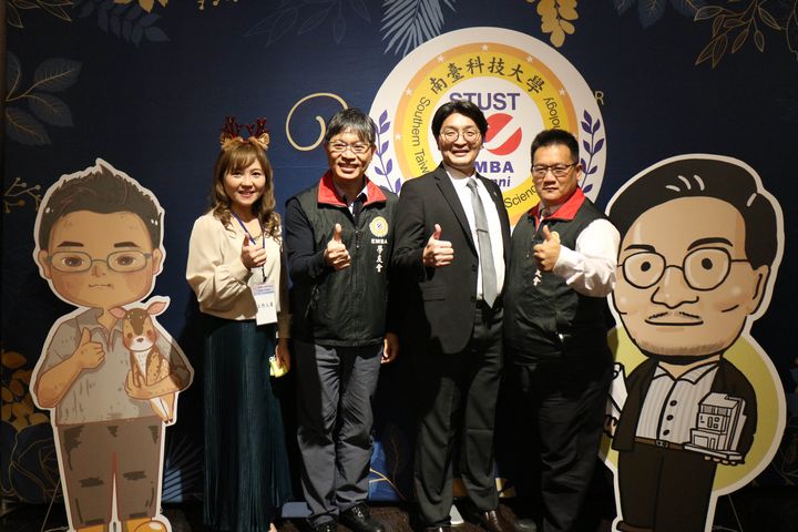 ▲南臺科大EMBA學友會缷任理事長林昆鋒(右一)與新任理事長黃志煌(右二)、EMBA鄭滄祥執長、EMBA校友及二側新缷任理事長Q版人像立牌合影。(南台科大提供)