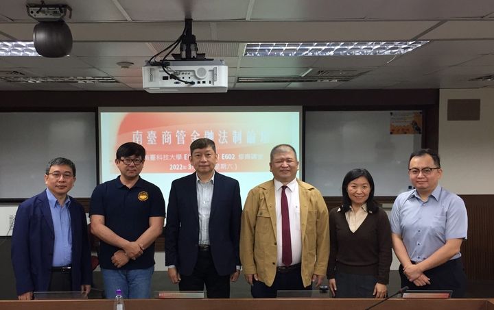 ▲「南臺商管法制論壇」,(由左至右)高科大科法所廖欽福教授、南臺科大財法所羅承宗所長、南臺科大商管學院張瑞星院長、成大法律系陳俊仁教授、成大法律研究所博士候選人池美佳律師、南臺科大財法所鄭植元助理教授。