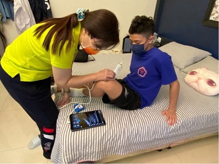 圖2:復健科李佳玲主任攜帶輕巧的超音波檢查設備到選手下榻的飯店,從開機、組裝不到一分鐘就可使用,可評估田徑選手常見大腿後肌拉傷,以超音波檢查可迅速了解受傷程度,亦可在運動場邊救護需要判斷關節出血或骨折、肌腱韌帶斷裂,在傳統理學檢查之外,可以輔助診斷更為精確,也可以了解傷害嚴重程度。
