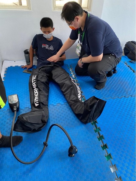圖3:林士峰物理治療師利用腿部肌肉迅速回復腿套通過空氣套循環按摩,促進血液循環和減少肌肉酸痛,幫助比賽後舒緩水腫,更快恢復,以最佳身體狀態再進行下一場賽事。