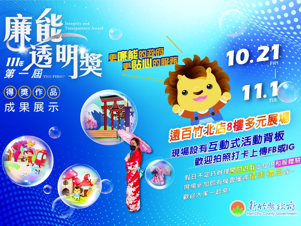 新竹縣政府領先非六都地方政府,111年首次舉辦第一屆「廉能透明獎」,透過正向激勵競爭的方式,鼓勵各局處暨所屬單位努力推動透明化便民措施。為提供民眾進一步瞭解竹縣府為民服務之各項措施,竹縣首屆「廉能透明獎」自今(10/21)日起至11月1日止,為期12天,在遠東百貨竹北店八樓多元展場舉辦成果展示活動,歡迎民眾踴躍前往觀賞,周末不定時辦理闖關遊戲並提供和服體驗,現場參加即有機會獲得精美禮品。