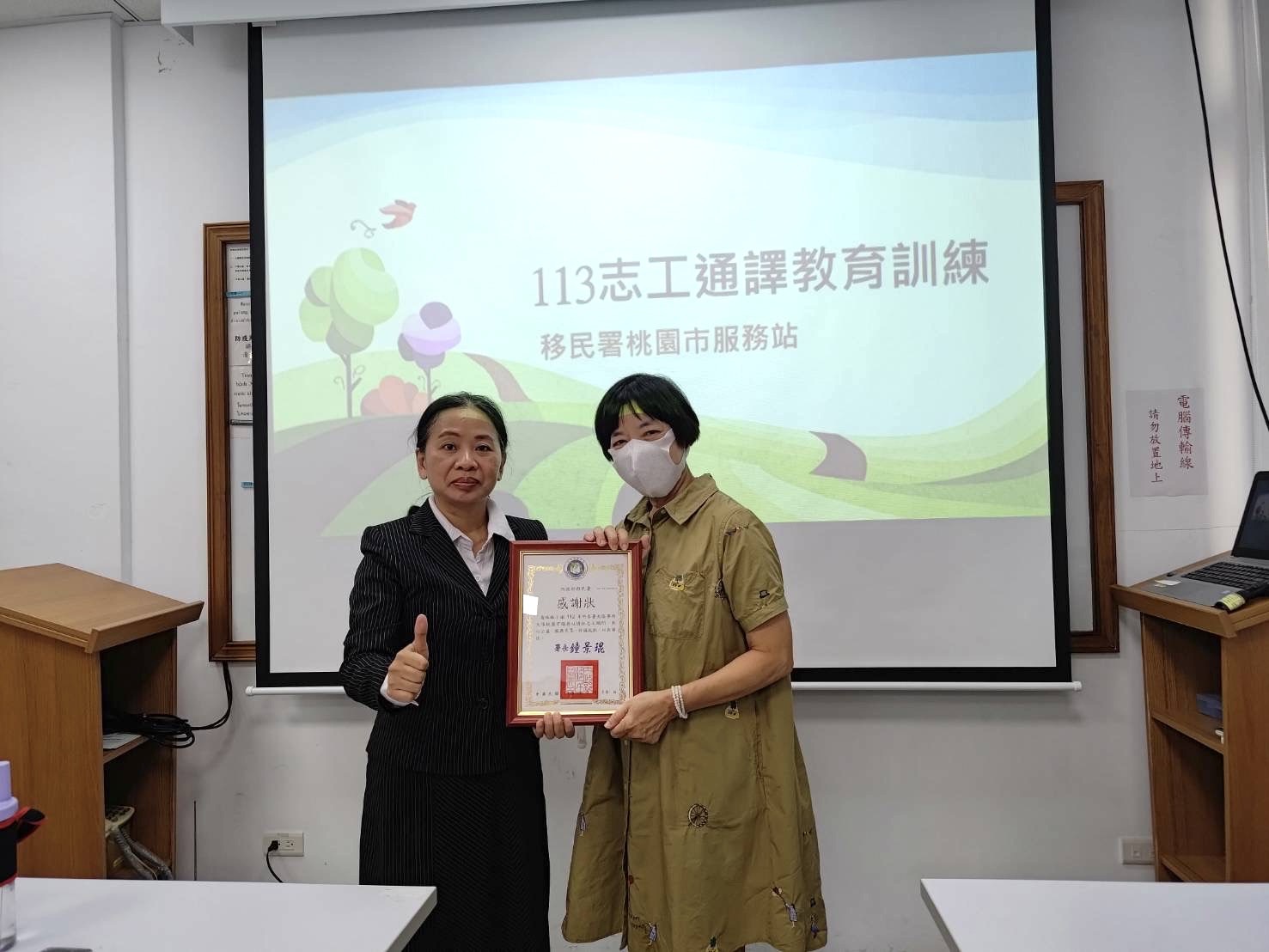 【視傳媒記者袁慧心/桃園報導】為精進志工與通譯人員服務知能與品質,提供民眾更好的服務,移民署北區事務大隊桃園市服務站日前舉辦「113年度志工及通譯教育訓練暨優良志工表揚活動」,安排一系列的研習課程,除了有最新居停留法令的課程,也特別邀請桃園市志願服務中心講師黃俊維、錦興國小營養師莊宇晴,分別講授「溝通與協調技巧」、「健康飲食與疾病預防」。活動中並公開表揚112年度優良志工喬珠珠及徐惠美,以及感謝其他志工及通譯人員的奉獻及熱忱服務。