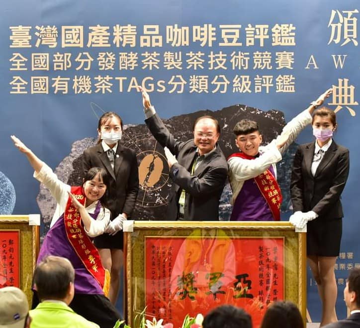 照片5-2020年小頭木-葉重霈-與媽媽頭木婆-林麟真母子同框,寫下台灣製茶比賽紀錄的歷史(頒獎人是農業部茶及飲料作物改良場場長蘇宗振場長)