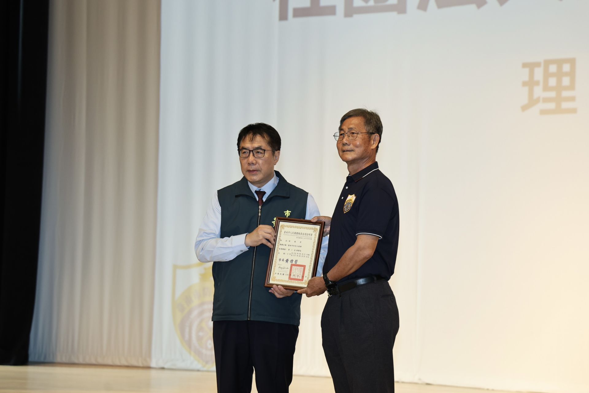 ▲黃偉哲頒發防災士協會理事長證書予前環保局代理局長侯俊彥,期勉打造台南成為最具韌性安全城市。(新聞處 提供)