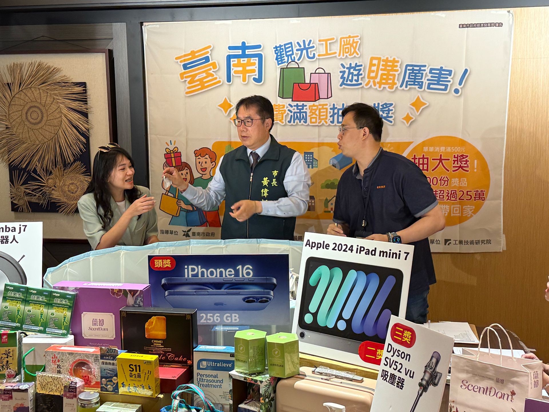 市長黃偉哲表示,活動期間,民眾只要至合作的21家觀光工廠消費滿500元,即可獲得摸彩券參加100個獎品抽獎。本次獎項內容相當豐富,涵蓋多樣化的3C產品及生活家電,以及各觀光工廠精心準備的特色好禮。其中摸彩品包含最大獎iPhone 17外,還有平板電腦、掃地機器人、液晶電視、任天堂 Swith、生活小家電和觀光工廠商品等多項夢幻逸品,讓遊客除了享受購物與體驗樂趣外,還有機會滿載而歸。等多項夢幻逸品多項限量好禮,為支持活動的遊客帶來滿滿驚喜。