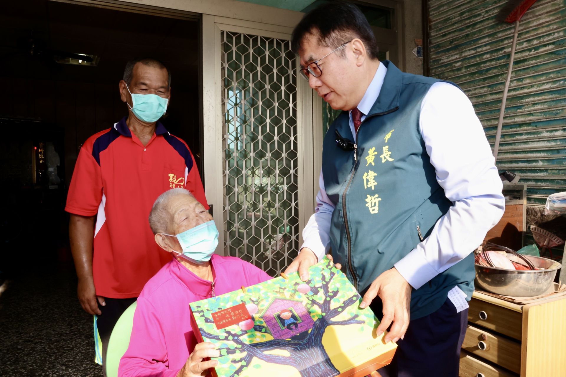 ▲市長黃偉哲致贈中秋月餅禮盒,關懷丹娜斯颱風受災戶。(新聞處 提供)