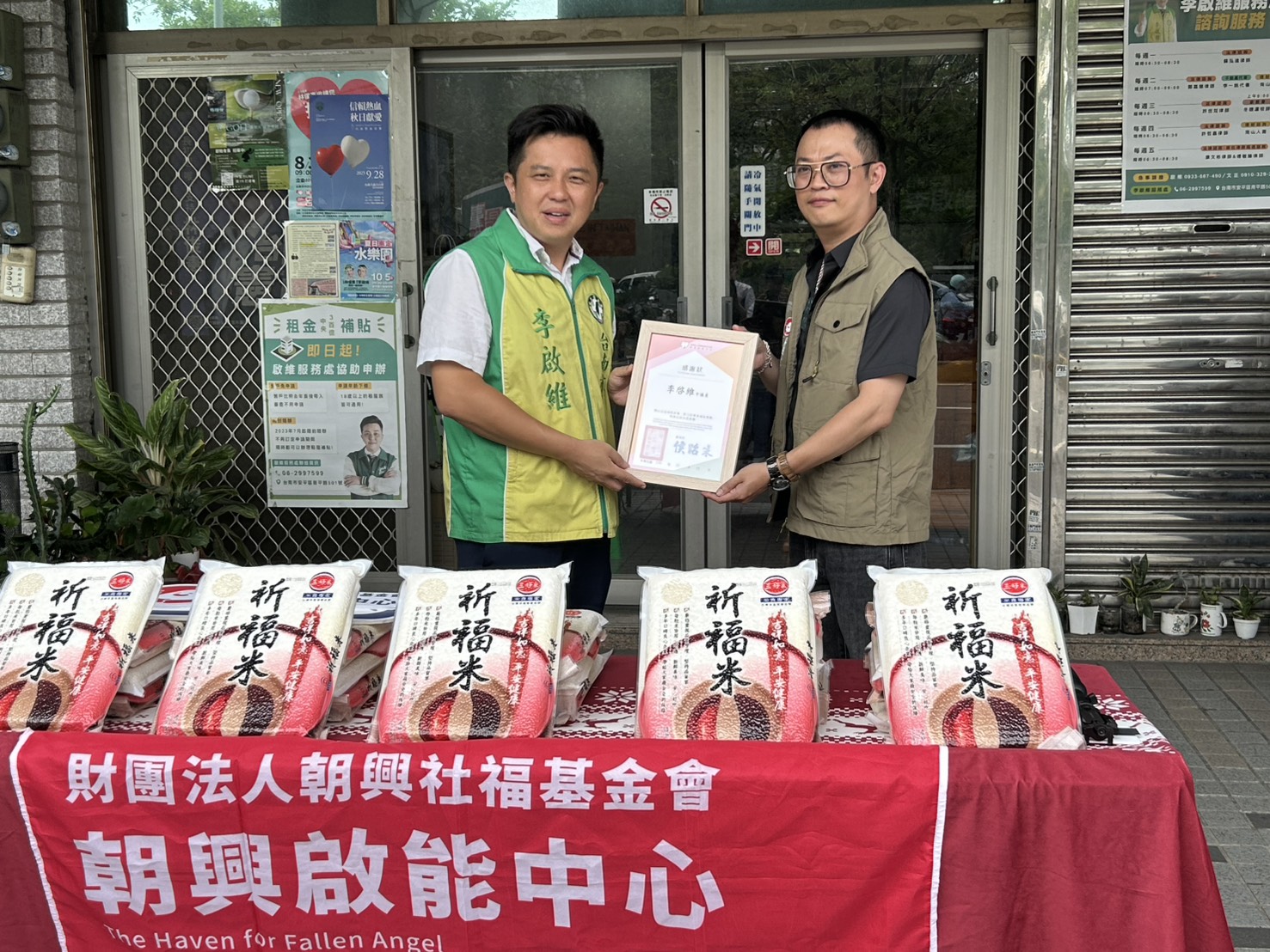 市議員李啟維服務處結合社會各界善心人士及熱心公益企業,共同投入關懷弱勢的行列,捐贈7萬6千元及白米2千58公斤,協助朝興啟能中心,讓憨星人們在生活上獲得更多支持與溫暖。1日上午11點在李啟維服務處舉行捐贈儀式,由朝興啓能中心主任湯宗益及5位憨兒及社會局專門委員陳宜君出席代表受贈。