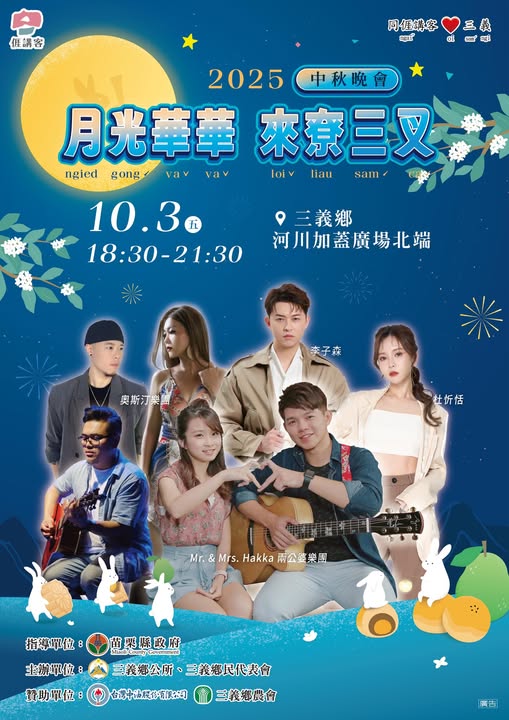 「2025月光華華-來尞三叉中秋晚會」將於10月3日(星期五)晚間在三義鄉河川加蓋廣場北端隆重登場!本次活動由三義鄉公所與三義鄉民代表會共同主辦,在苗栗縣政府指導下,並感謝台灣中油股份有限公司、三義鄉農會及多方單位的大力支持與贊助,活動內容精心規劃,不僅有歌舞表演、樂團演出,還有眾多摸彩好禮,期盼與鄉親一同營造「月光華華」的浪漫氛圍與中秋團圓的喜悅時刻。