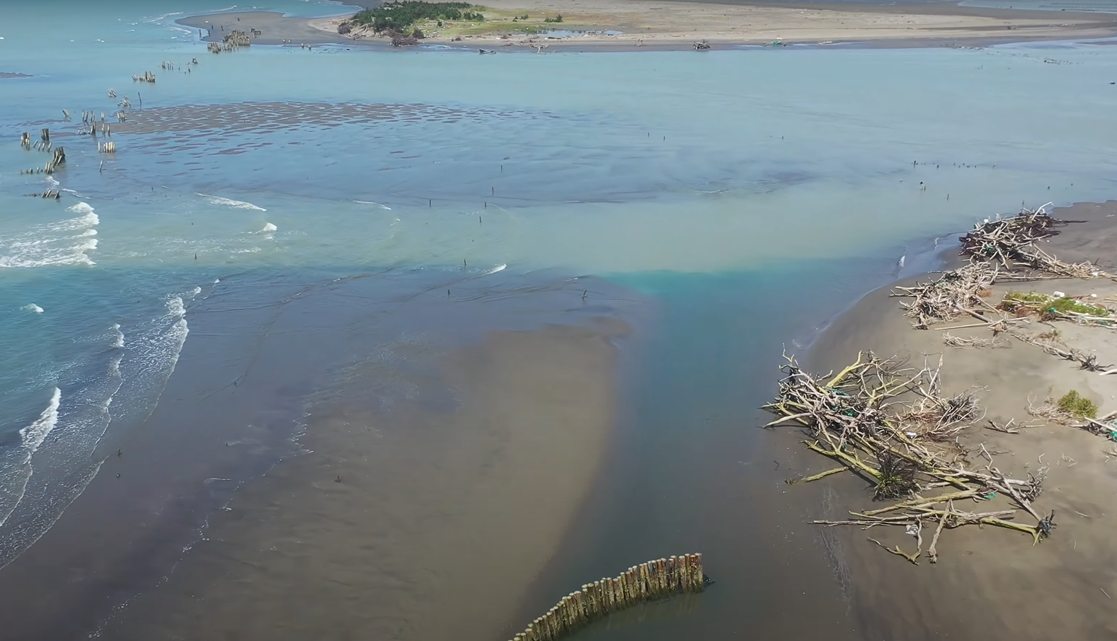 ▲沙洲設置竹樁、沙腸袋等NBS工法減緩侵蝕。(水利局 提供)