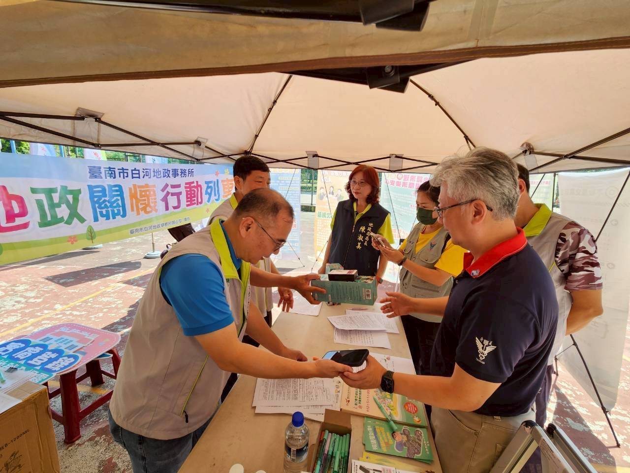 由於山區聚落分散、老年人口較多,民眾對於法規及市府便民資訊觸及較為不便,在黃偉哲市長的指示下,臺南市地政局長陳淑美帶領各地政事務所積極走入偏遠社區宣導地政服務,4日在白河區仙草國小,加入由奇美醫學中心鄭天浚及郭行道兩位副院長親自領軍的巡迴醫療服務、在醫療團隊免費照顧民眾健康的時候,同步提供長輩們不動產相關業務諮詢及服務措施宣導,更當場受理民眾申辦防詐利器「地籍異動即時通」服務,充分發揮1加1大於2的效益。