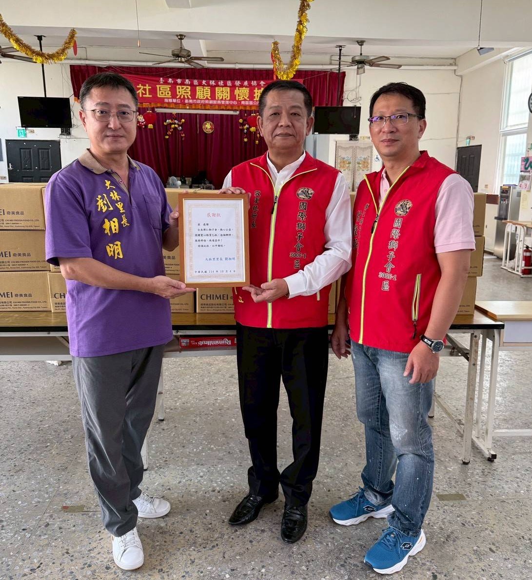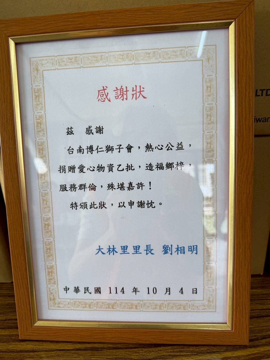 劉相明感謝奇美公司、博仁獅子會的熱心,並致贈感謝狀,表彰其造福鄉梓,服務群眾的善良義舉,讓社會上充滿溫暖、也讓受贈人倍感溫馨!