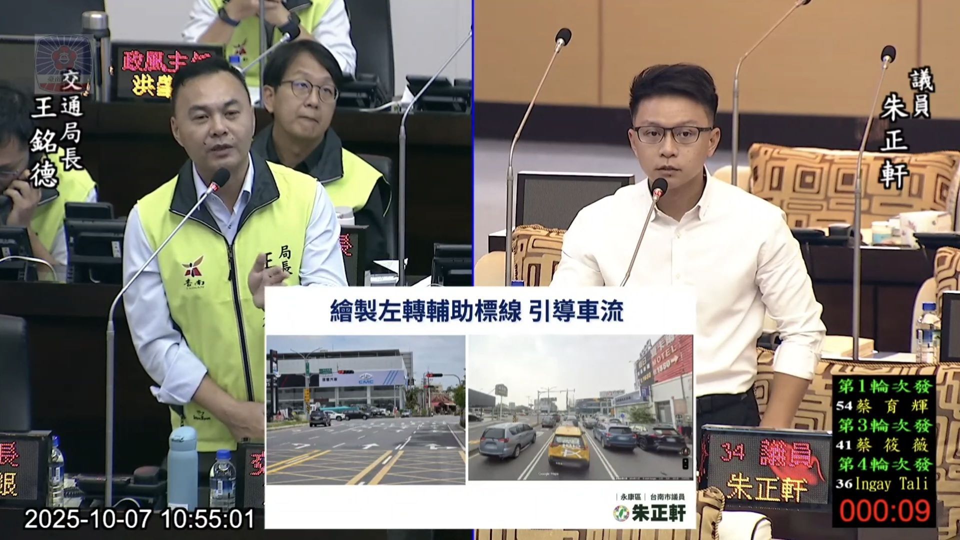 朱正軒也建議雙向有左轉附加車道的路口,應標配延長車道設計,以提高整體通行效率。對此,交通局長王銘德承諾,將全面盤點各主要幹道與重點路口,逐步建立「輔1」預告標誌、引導標線、延長車道等為標準配置,作為市區交通工程設計基準。