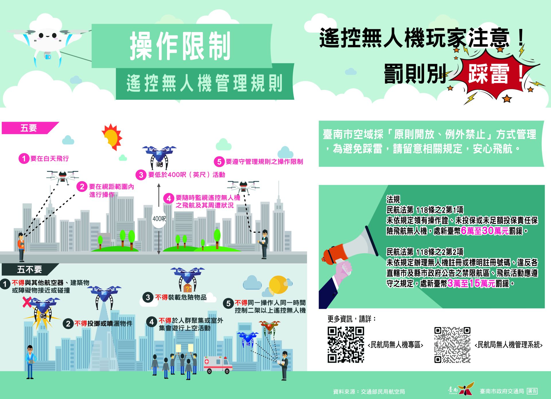 台南市無人機空域採「原則開放,例外禁止」方式管理,臺南市交通局長王銘德呼籲請飛友飛行前確認空域限制,並遵守「5要5不要」操作限制原則。