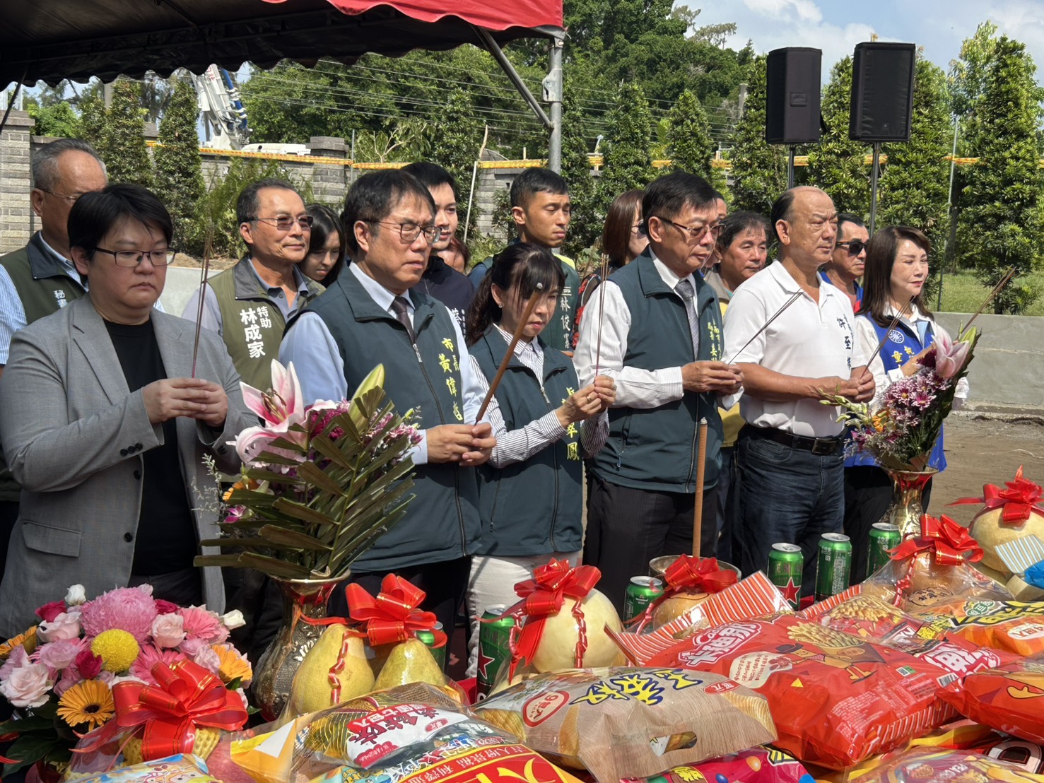 ▲市長黃偉哲率領民政局及衛生局兩單位及民意代表一同敬拜天地眾神,祈求動土平安。(記者黃雋淮 攝)