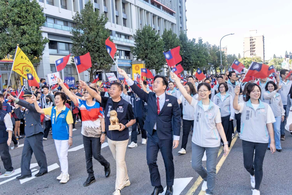 ▲新竹市府今(10/10)日上午7時於金城一路「將軍村」舉辦「舞耀國慶、竹韻齊揚」國慶升旗典禮,現場湧入超過1,500名市民朋友熱情參與。代理市長邱臣遠率領市府團隊共同慶祝中華民國生日。(圖/竹市府提供)