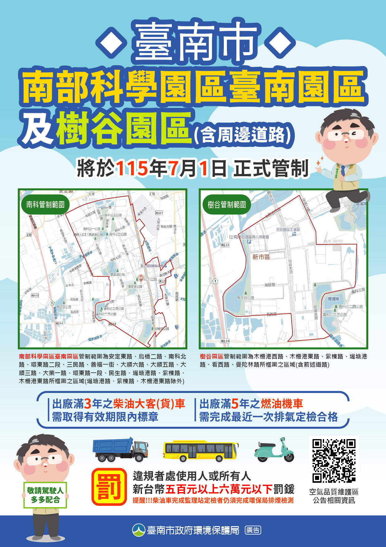 環保局說明,為配合114年新劃設的「南科園區」及「樹谷園區」空氣品質維護區政策,管制範圍將涵蓋周邊道路,並已啟動緩衝期宣導,提醒車主儘早完成相關檢驗。目前透過圖卡、宣導影片與官方臉書多元管道加強宣導,並提供機車簡訊提醒登記服務(https://reurl.cc/WOZmXD),柴油車主則可聯繫本局辦理登記(06-2686751#1508),避免因疏忽逾期受罰。