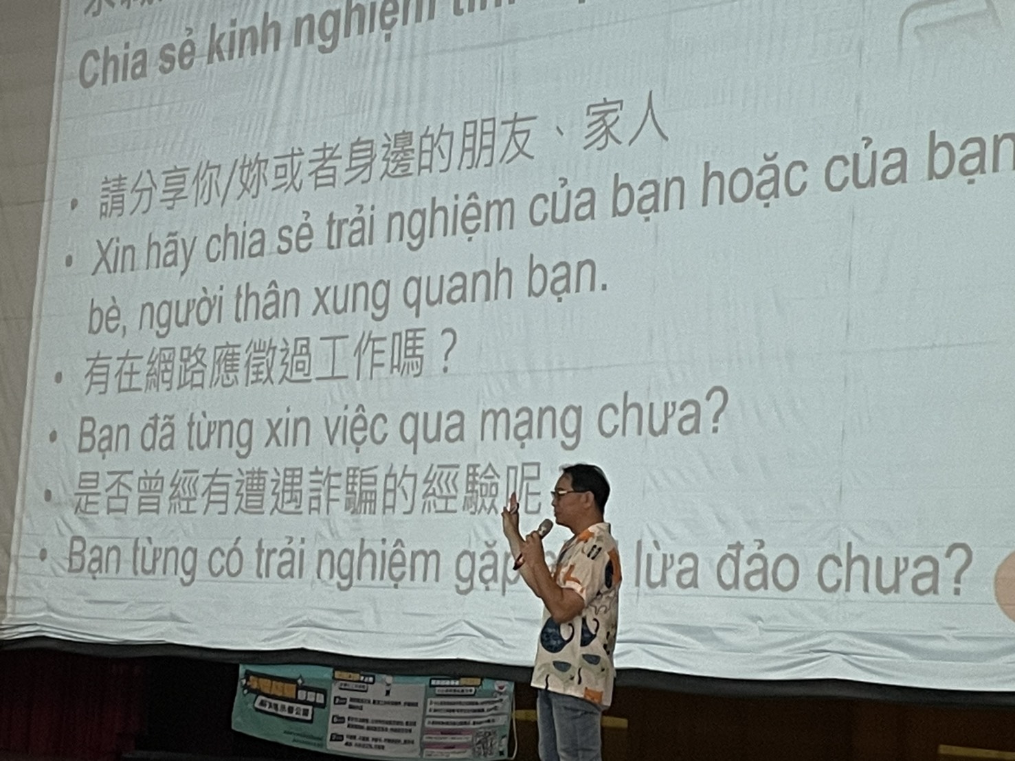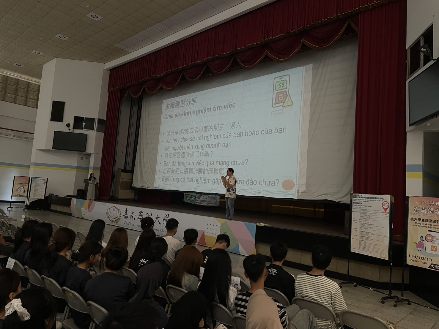 嘉南藥理大學國際暨兩岸事務處有鑑於開學後,該校境外學生打工遭遇詐騙的案例層出不窮,特與南市勞工局合作,開辦求職防騙宣講講座,特邀大台南總工會法勞工法令宣導講師曹仁豪擔任講師,加強該校越南籍境外學生打工時可避免遭受不良僱主的騙術,加強境外生了解於本地工作各項規定、求職防騙及就業隱私的正確觀念,灌輸薪資需公開示揭示,非必要不需提供就業隱私給雇主,特別也聘請越籍翻譯協助講師,轉化成境外生貼近的語言,以影音及實際案例加以分享,此次宣導講座前進校園辦理宣導,校方特別聚集越籍境外學生約400人,於該校大禮堂擴大辦理宣導講座。