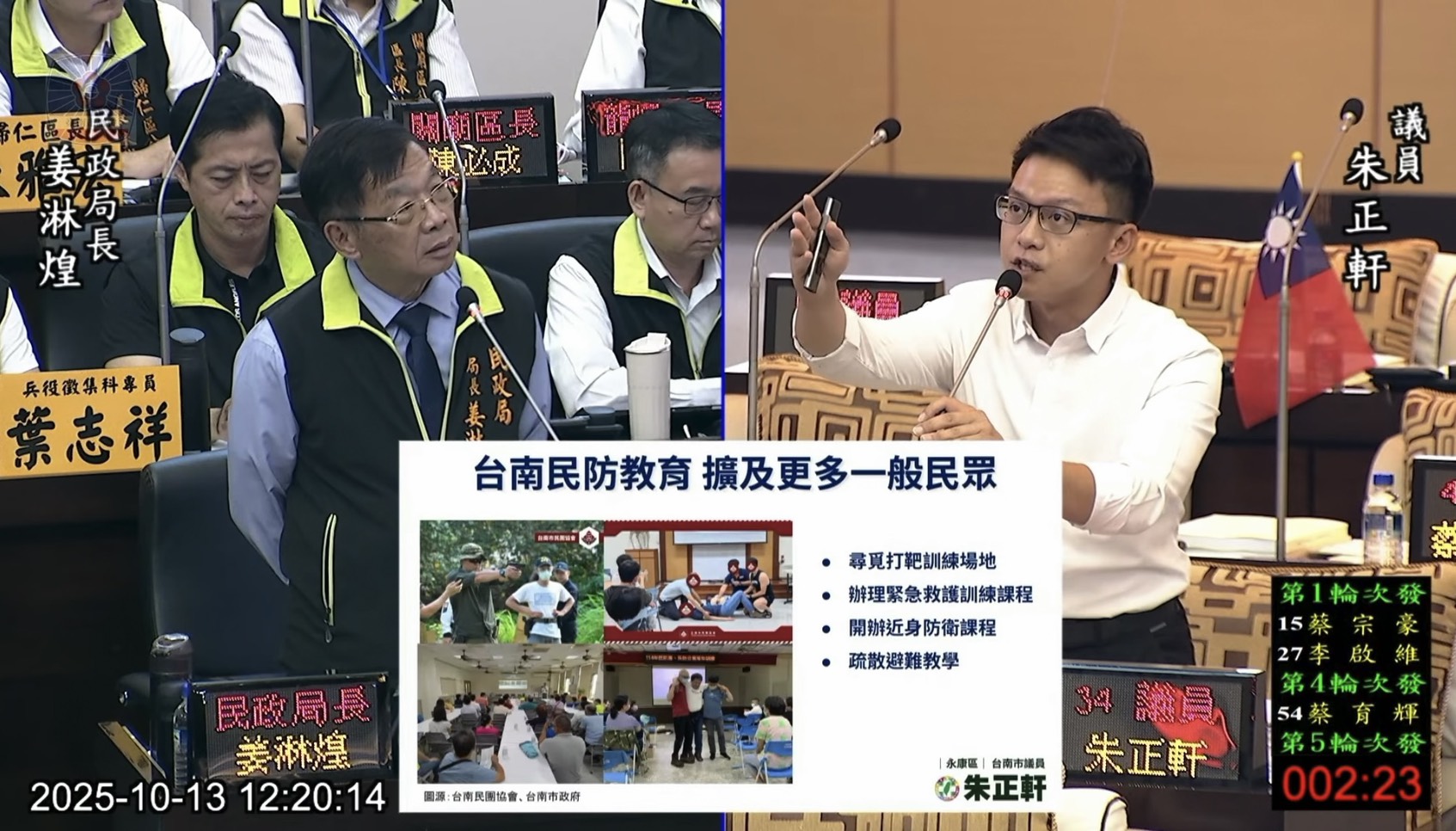 對此,民政局長姜淋煌回應,目前已推動里長、鄰長接受防災士訓練,未來將持續深化基層推動。朱正軒提醒,既然市府已有共識推動全民防衛深入社區,就應在預算編列上設置特定項目,確保有穩定財源與執行力。