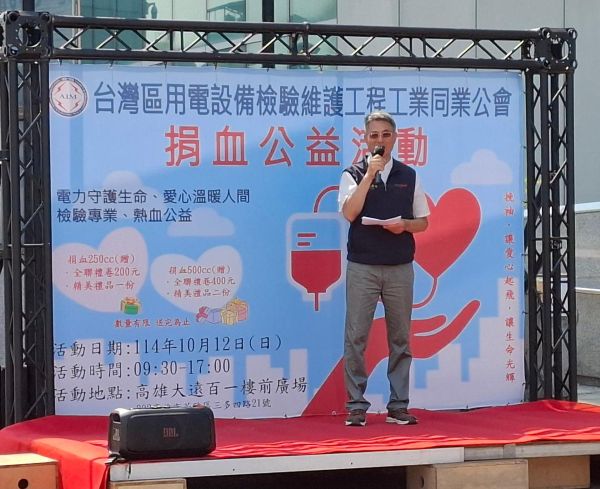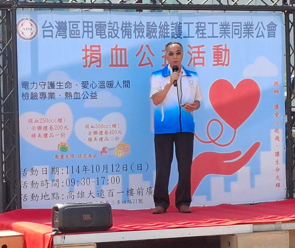 【視傳媒記者吉雄世高雄報導】全台血庫長期面臨供血緊繃,臨床用血需求屢屢告急。台灣區用電設備檢驗維護工程工業同業公會將於114年10月12日舉辦年度公益 捐血活動「你我的熱血,是他人等待救援的希望」,呼籲社會各界共同 響應,以實際行動支援醫療前線,為病患爭取更多生機。活動地點設於 高雄大遠百(高雄市苓雅區三多四路21號),上午9時20分捐血車進駐,展開全天捐血服務;上午10時舉行開幕儀式,邀請產官學界貴賓、會員代表及市民朋友出席,共同見證這場公益盛事。