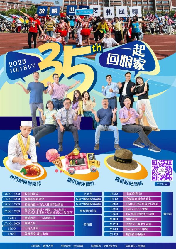 喜迎義守大學創校35週年,校慶系列活動自四月起熱烈展開,內容豐富多元,展現全校師生的凝聚力與創新能量。活動自「百年樹人 義起植樹」揭開序幕,象徵義大對永續精神與教育傳承的承諾;跨院聯合成果展與教學創新暨學生學習成果展,體現義大在教育創新與實作教學上的深厚實力;「國際文化義術節」融合多元文化,營造國際化校園氛圍;USR成果展則體現學校長期深耕社會責任的具體行動。此外,「卓越講堂」邀請傑出校友返校,與學弟妹進行青春對話,分享成長歷程與人生智慧。10月18日校慶當日下午起慶祝活動接力登場,包括:「歡聚義堂-系友回娘家」、「音為有您-音樂會」、「35卓越 義領未來-校慶典禮」、「紫愛義大-千人大拋帽」及「笑迎故人相見歡,千人校友回娘家晚宴」,歷屆校友、師生與貴賓齊聚一堂,共同見證義守大學三十五年來在教育創新、國際交流與社會實踐上的輝煌成就與卓越願景。