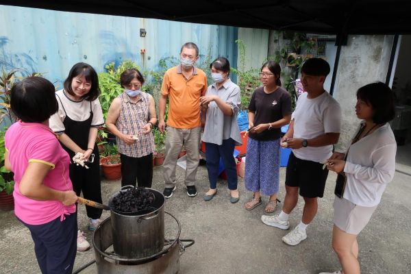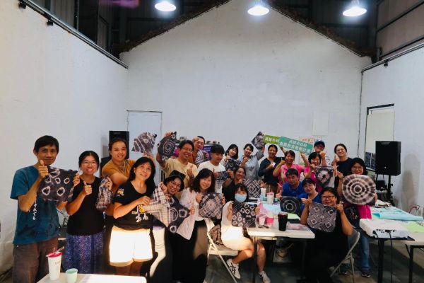設計實作課程則於10月份舉辦,12日上午安排學員走訪大寮拷潭地區,認識高雄早期濕地環境的重要作物「菱角」,並邀請文化環境發展協會理事長黃思慈導覽解說,黃理事長說,「拷潭」地名中的「拷」為台語「洘(khó)」的音轉,意指黏稠泥漿,使學員深刻理解環境條件與作物間的關聯,此外還透過菱角殼汁液染布體驗,進一步探索農業副產物再利用的可能。在導覽過程中,有人好奇菱角的構造與授粉方式,而來自燕巢國中的生物老師張淑娥,也是本次研習的學員之一,立馬發揮專業,現場講解雌雄蕊特徵,甚至後來更以顯微鏡呈現菱角花與葉柄膨大氣囊的構造,無私分享給大家,展現教育與農業跨領域合作帶來的教學加乘效果。當日午餐則是以日品有機米、仁允牧場飼養的產銷履歷豬肉及在地菱角入菜的大寮風味饗宴,讓學員們在食與作之間體驗大寮的風土與文化。