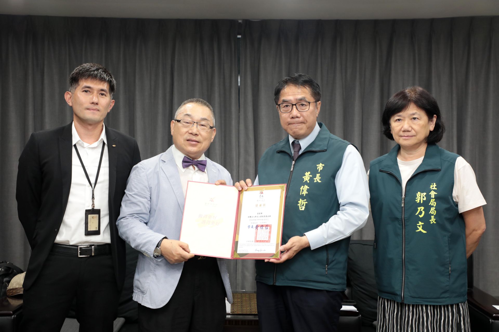 ▲新光人壽慈善基金會捐贈善款予台南市政府,由巿長黃偉哲(右二)代表市府受贈,並頒發感謝狀。同時與新光人壽慈善基金會執行長唐志豪(左一)、新光人壽慈善基金會副執行長陳彥名(左二)及社會局局長郭乃文(右一)合影。(新聞處 提供)