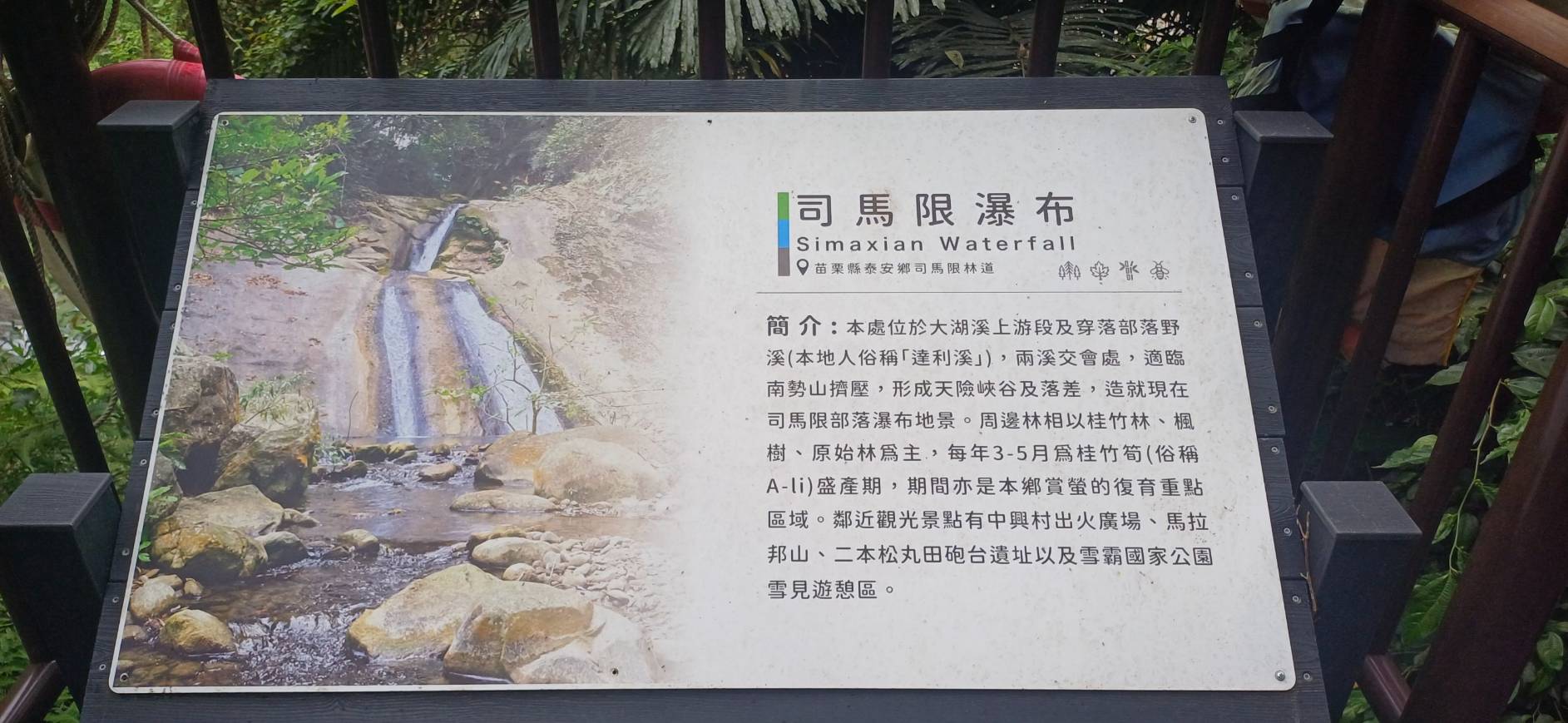 司馬限瀑布位於大湖溪上游段及部落野溪(族人俗稱「達納溪」),兩溪交會處,適臨南勢山擠壓,形成天險峽谷及落差,造就現在司馬限部落瀑布地景。本區段台灣西北部海床油田的邊緣路頭處,河床底約有4-5處天然氣出火點,亦是未來可開發的觀光資源。泰安鄉長陳吉基 竭誠歡迎您的蒞臨!
