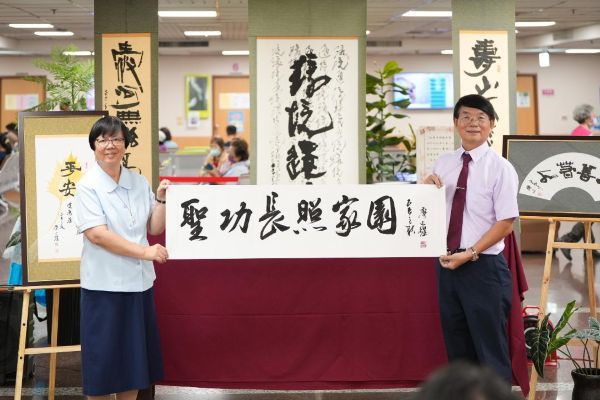 這場義賣源自「有愛同行—廖火煌古稀書法展」,展覽日前於高雄市文化中心至真二館盛大舉辦,吸引眾多貴賓、學者與書法愛好者參與。廖火煌理事長以「愛」為創作核心,作品風格溫潤沉靜、氣韻雋永,展現深厚書藝與人文關懷。展覽的契機,來自廖理事長夫婦偶然看到聖功修女會為籌建「聖功長照爺奶村」所拍攝的勸募廣告—「雨淋不熄,希望不滅,愛的進行式需要你接力」。畫面中修女們在風雨中勘查工地、堅定為長輩築夢的身影深深打動他們,因而決定以書法義賣拋磚引玉,為修女會籌建爺奶村盡一份心力。