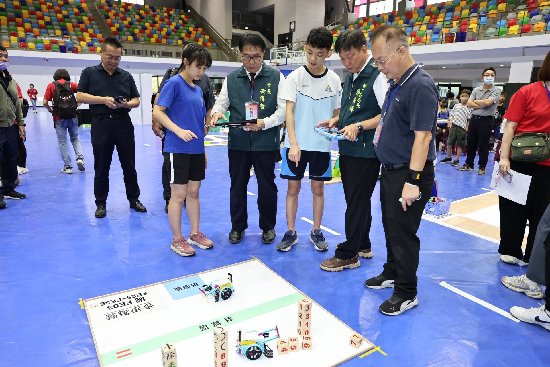 ▲市長黃偉哲與評審走訪各賽區,仔細觀察學生如何透過AI與程式規劃,完成指定任務。(教育局 提供)