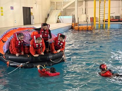 圖2、臺灣風訓公司參訓學員進行海上求生安全訓練,強化防護意識。