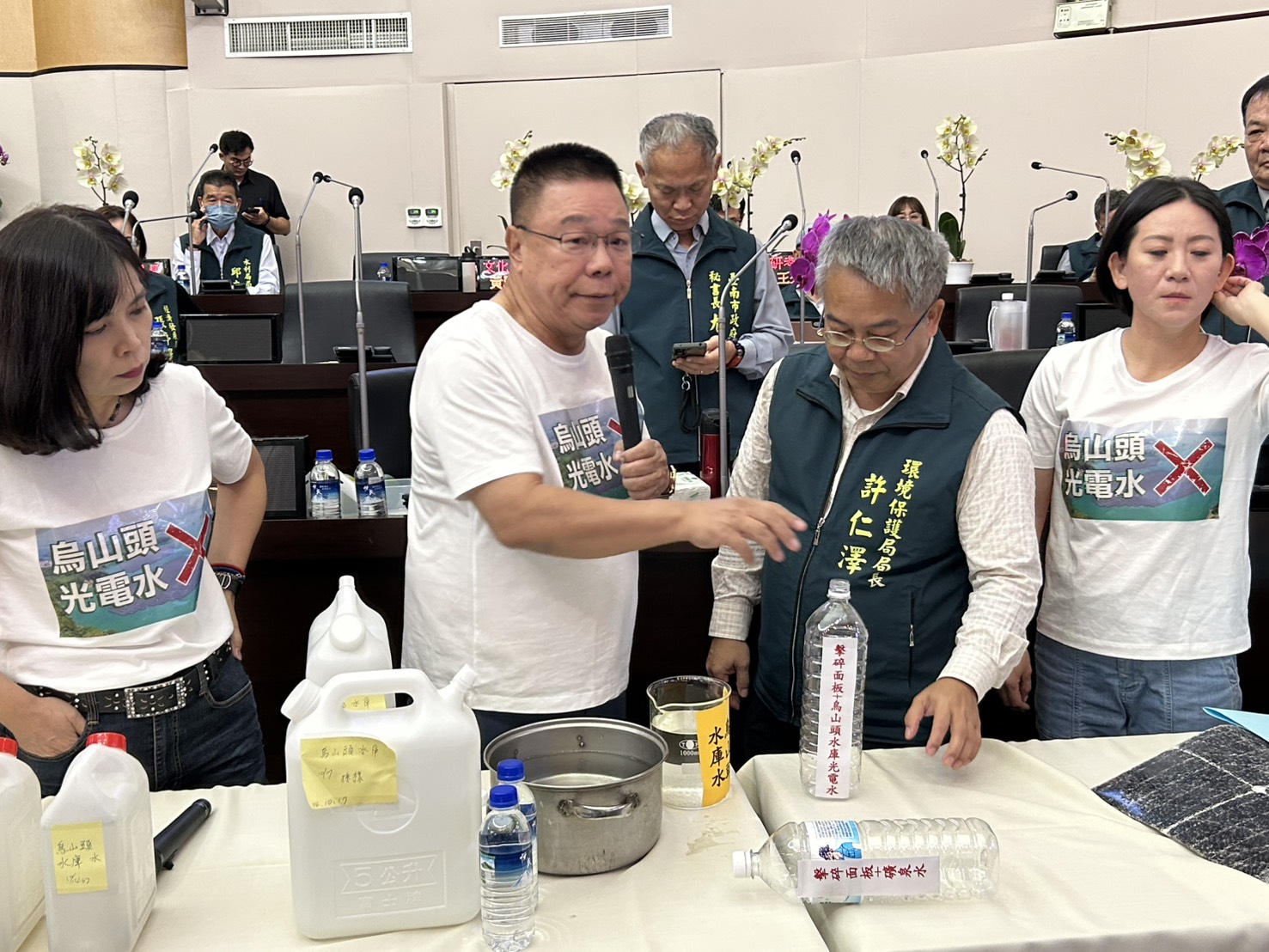 繼日前秀出兩瓶搭乘竹筏取樣的,烏山頭水庫出口水和面板水,短短幾日已變綠色,跟自來水及礦泉水比較現場秀後,今天三人聯合總質詢,實驗秀2.0版,現場請環保局長許仁澤敲碎,將碎片置入日前實驗秀的烏山頭水庫水中,請環保局長許仁澤簽名後,立刻貼上封條,靜置3個月後,再拿出檢驗看是否如民進黨中央所言,烏山頭水庫民生用水,完全不受光電板影響?