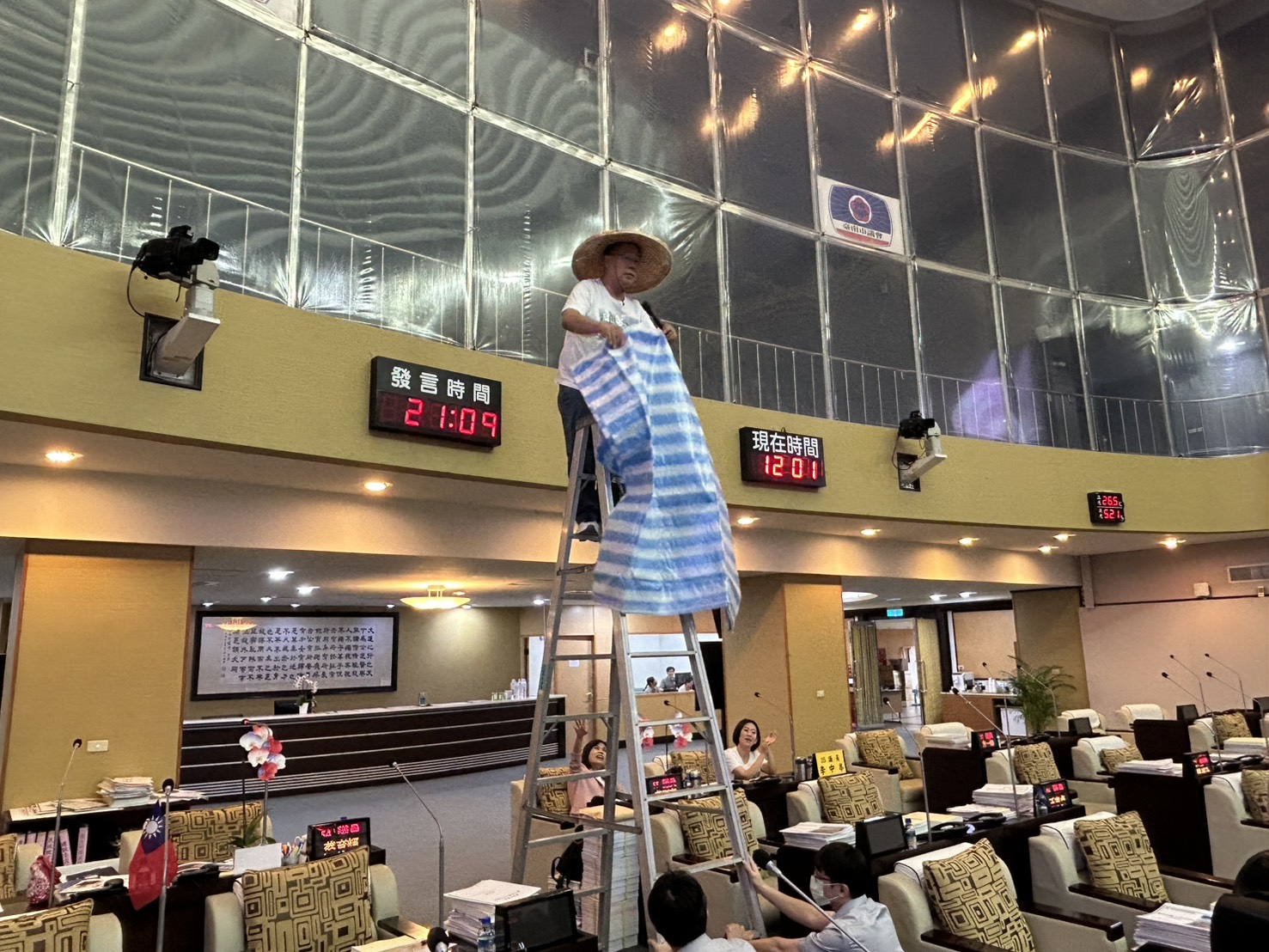 ▲市議員蔡育輝故意在議會議事廳上爬到一樓層高,諷刺總統賴清德只爬三層鋁梯送水給工人喝,這樣民調不會比較高。(記者黃雋淮 攝)