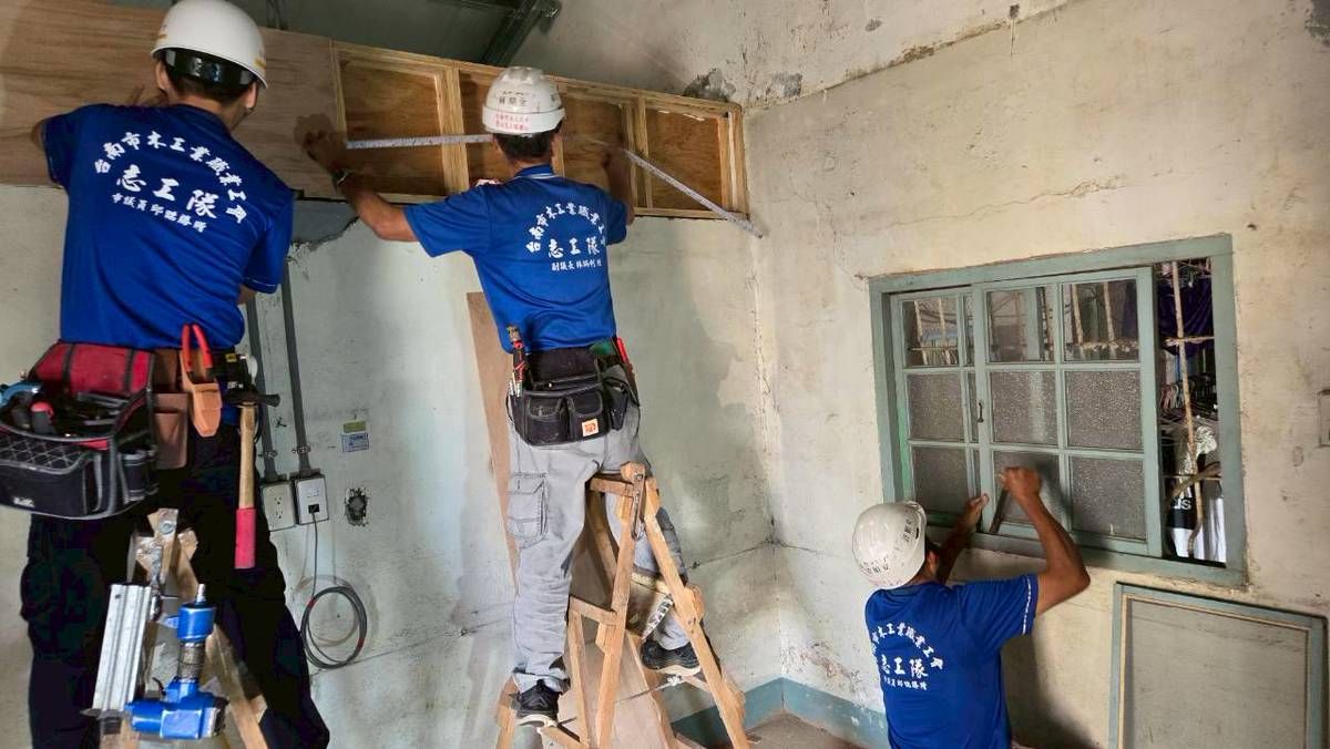 同時,位於安南區的潘女士家庭,也在此次颱風中受創。潘女士因需長期洗腎,兒子則因膝蓋軟骨斷裂開刀後身體未復原,僅能從事臨時水電工作維持家計,每月收入約兩萬多元,生活艱辛。颱風造成其住屋結構受損,家中經濟困難無力自行修繕。勞工局於通報後立即啟動「做工行善團」協助機制,展開多工會協作行動:由電氣業職業工會負責電氣斷電作業、泥水業職業工會進行平房與樓房拆除、電子機械加工職業工會協助搭設平房屋頂,並由連景公司提供施工架支援,確保修繕工作安全順利進行。