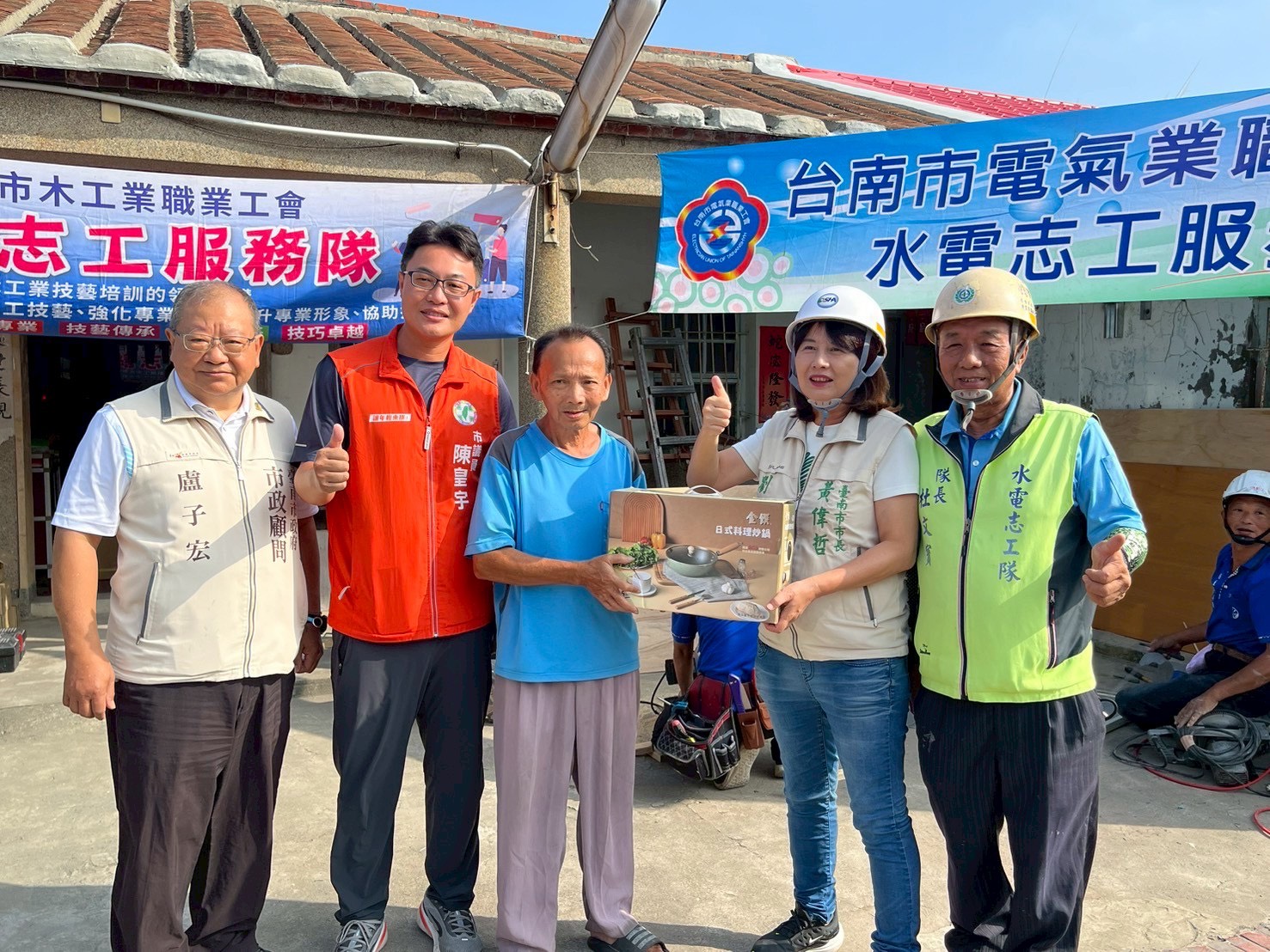 值得一提的是,台南市電器裝修業職業工會多次捐助修繕材料費,響應黃偉哲市長的「大水庫理論」,今日郭進光理事長及林榮義常務理事等人也帶來飲品慰勞志工,充分展現出企業與工會攜手關懷弱勢、共築希望的精神。