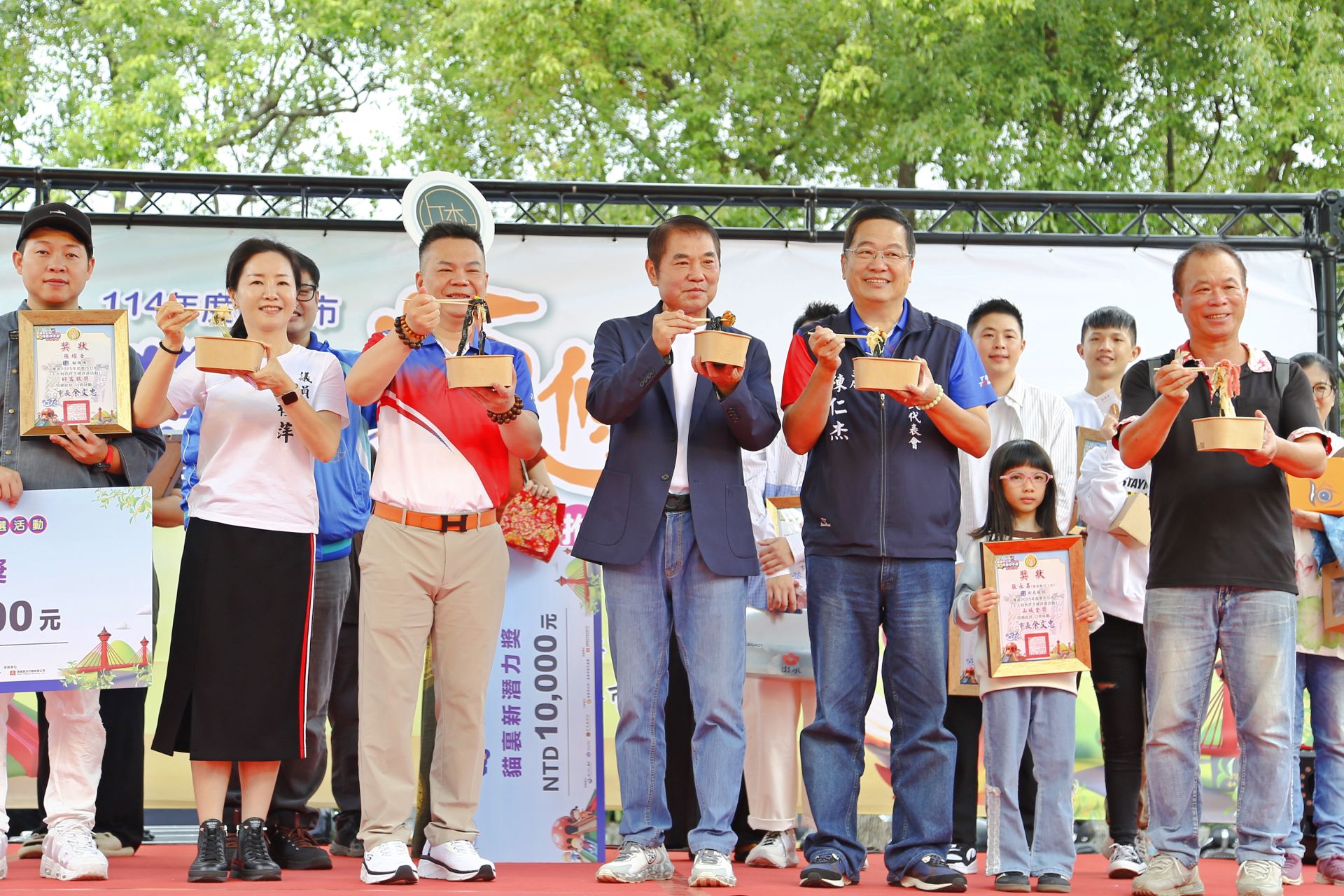 本次徵選設有「山城金獎」、「好客銀獎」、「客藝銅獎」及「貓裏新潛力獎」等獎項,總獎金高達十五萬元,鼓勵更多在地創作者發揮巧思,開發兼具文化底蘊與市場價值的伴手禮。得獎名單包括:「山城金獎」-彩色粄條、「好客銀獎」-猫狸棒、「客藝銅獎」-紫錐永恆(紫錐花&紫錐花茶),以及「貓裏新潛力獎」-丘森(貓裏紅茶×桂花烏龍×貓奉茶禮盒)、小王子手作坊平安淨身禮盒、山城護旅、烏虎VuHu三色蛋捲×無咖啡果茶、ZAO LEGACY棗承、柑好茶緣客庄祝福、茶陶苗境等七家優質店家脫穎而出,展現苗栗職人創意與在地風情。