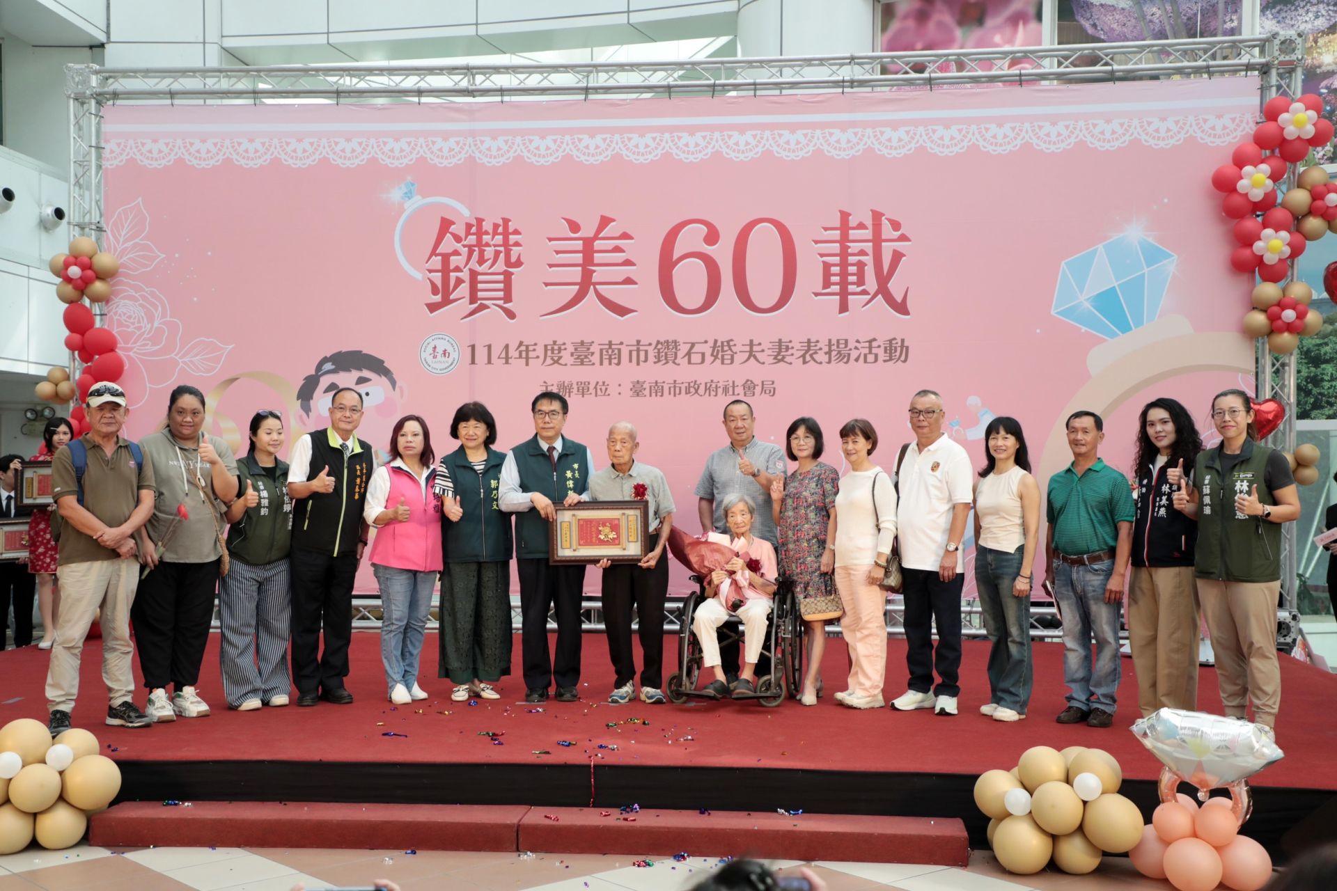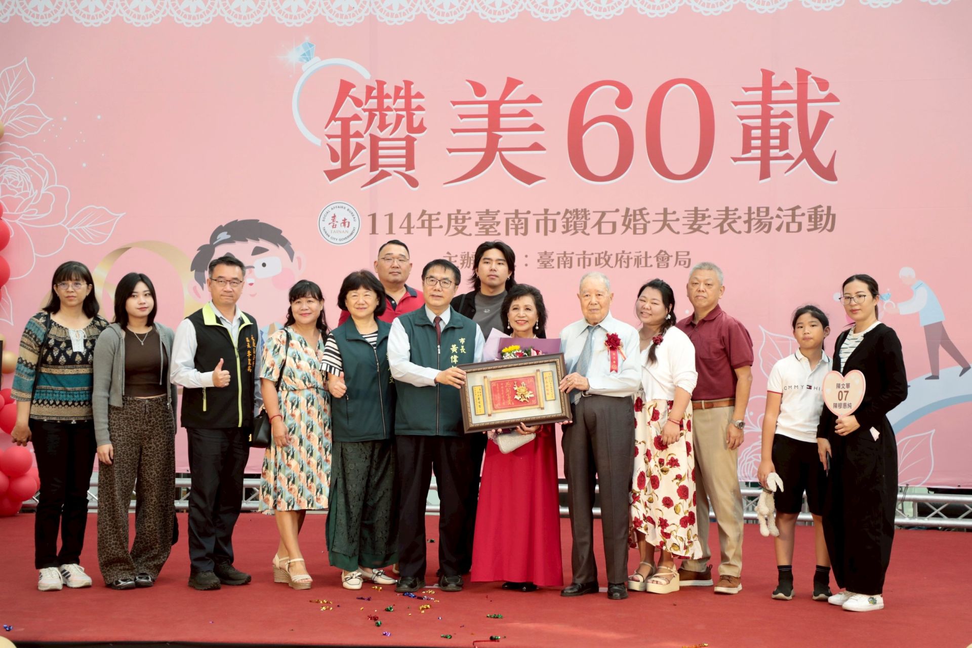 社會局表示,市府今(114)年辦理鑽石婚表揚共表揚70對,首場於10月18日在民治市政中心南瀛堂完成33對夫妻的表揚,要達到鑽石婚的成就,不僅夫妻雙方婚齡要長久,同時也需要長壽健康,才能彼此相伴到老,本次上台受表揚的長者們都是兒孫滿堂,人生的幸福莫過於此。市府未來會持續強化對高齡人口及各年齡的家庭照顧政策,讓每位老人、兒少、婦女、身障等市民,在台南快樂宜居,過得長壽健康又幸福。