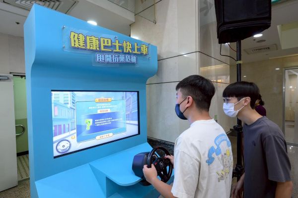 圖說5. 高醫「健康巴士快上車,甩開抗藥性危機」展覽,除了衛教展板外,更設有互動裝置,讓民眾化身「健康巴士駕駛員」。