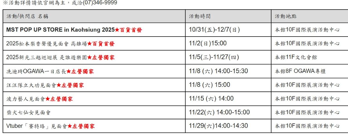 以「星級玩樂派對」為主題,匯集人氣卡司與爆款IP話題活動,打造全台最強流量話題!不僅多場名人見面會連番登場;MST POP UP STORE in Kaohsiung 2025集結知名IP《崩壞3rd》、《崩壞:星穹鐵道》、《原神》、《絕區零》、《未定事件簿》等官方周邊,帶來多款「首次在台灣發售」的限量新品,同步推出『滿額贈活動』,有機會抽中各大 IP 的限定特典,話題熱度席捲全台。人氣Vtuber「賽特珞」、中信兄弟啦啦隊成員冼迪琦都將現身左營店與粉絲熱情互動,日本殿堂級聲優「松本梨香」更將首度於高雄演唱,以經典熱血旋律掀起回憶殺浪潮。