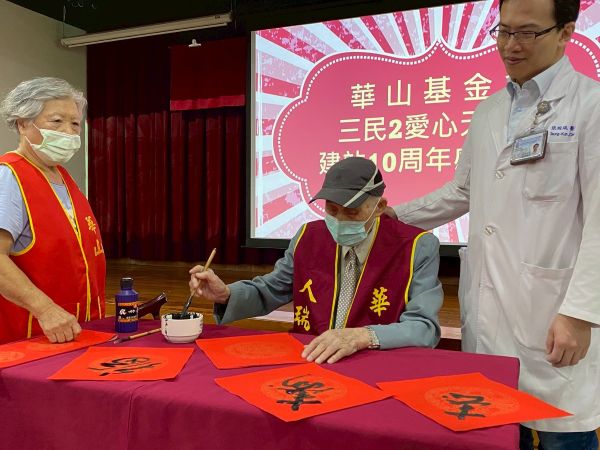 人瑞蔡爺爺原本在高醫就醫,因為年邁無法獨自前往,經社政單位轉介華山基金會提供陪同就醫服務。蔡爺爺為答謝各方善士,現場揮毫寫春聯,不僅展現長輩精神風采,更期許在長者服務的路上,華山與高醫可以持續前行、百年不墜。活動中也分享華山服務影片,並邀請與會來賓及長輩、義工們一起切蛋糕,慶祝三民2天使站10週年生日快樂。