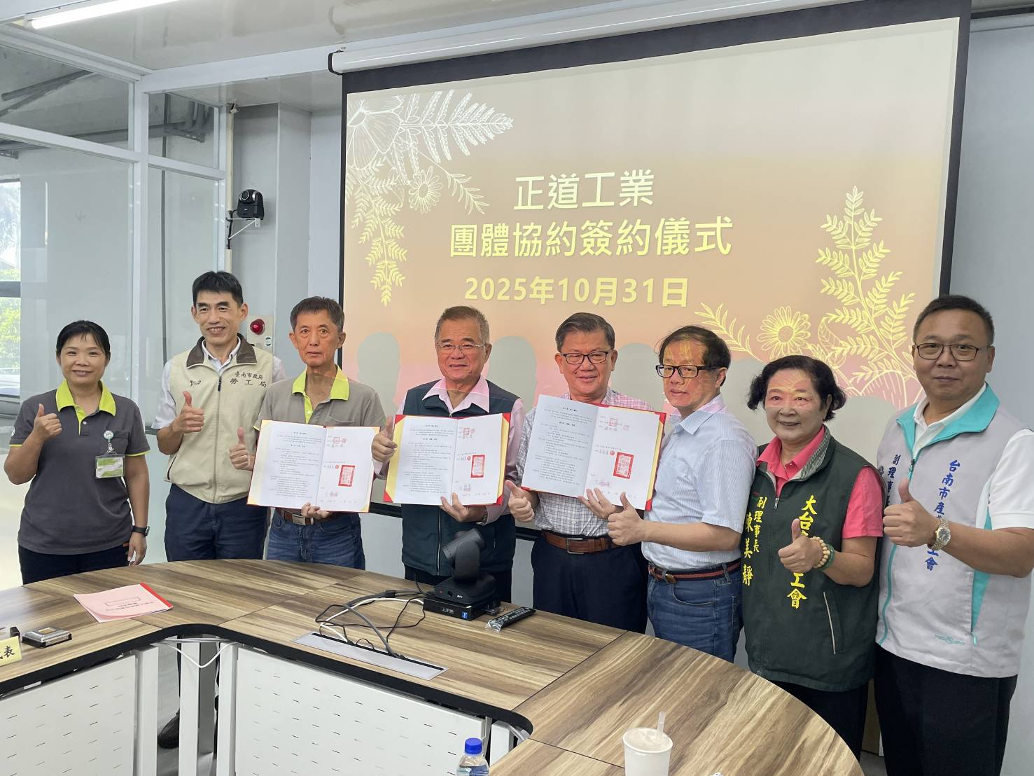 為穩定和諧勞資關係,共同營造幸福職場,正道工業股份有限公司工會與正道工業股份有限公司歷經多次理性協商與充分溝通,雙方於今(23)日成功達成團體協約之續約,簽約儀式由勞工局王鑫基局長、大台南總工會陳美靜副理事長及台南市產業總工會方子明副理事長共同見證。