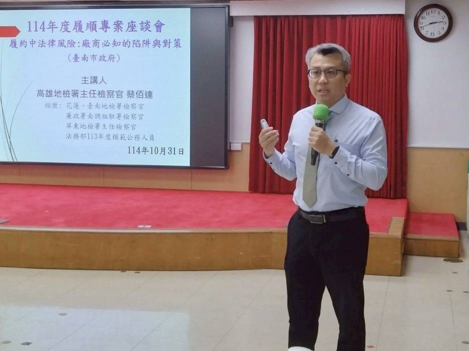 ▲高雄地方檢察署蔡佰達主任檢察官分享「履約中的法律風險」。(政風處 提供)